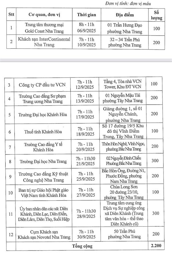 Nhằm đáp ứng nhu cầu cấp cứu và điều trị cho bệnh nhân, đồng thời phát huy tinh thần nhân ái và sẻ chia vì cộng đồng, Trung tâm Huyết học - Truyền máu Khánh Hòa trân trọng thông báo lịch tiếp nhận máu tại cộng đồng trong tháng 9/2025 như sau:
