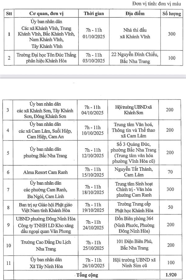 Lịch tiếp nhận máu tại cộng đồng tháng 10/2025