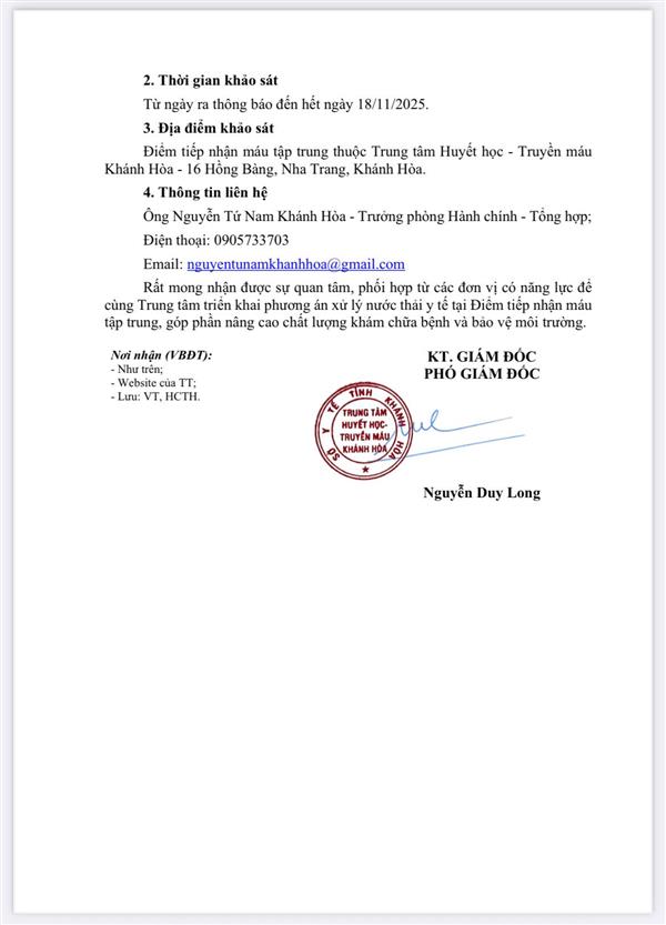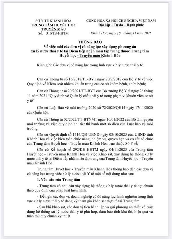 THÔNG BÁO Về việc mời các đơn vị có năng lực xây dựng phương án xử lý nước thải y tế tại Điểm tiếp nhận máu tập trung thuộc Trung tâm Huyết học - Truyền máu Khánh Hòa