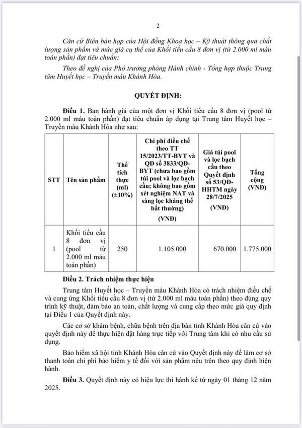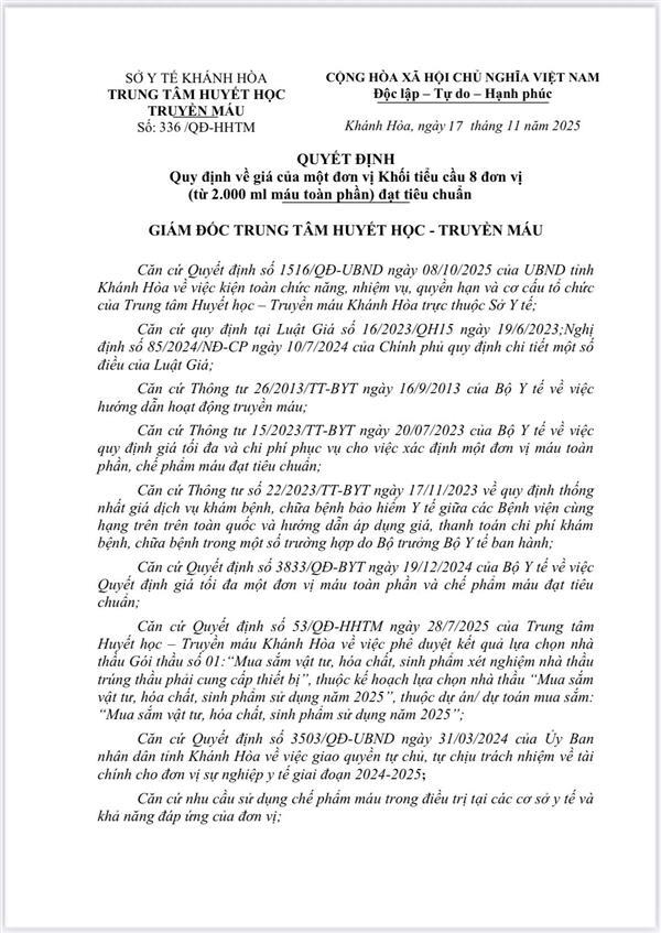 tài liệu đính kèm : /Portals/0/336-QD-HHTM%20QUYT%20DNH%20Quy%20dnh%20v%20gia%20ca%20mt%20don%20v%20Khi%20tiu%20cu%208%20don%20v%20%28t%202_000%20ml%20mau%20toan%20phn%29%20dt%20tieu%20chun.pdf