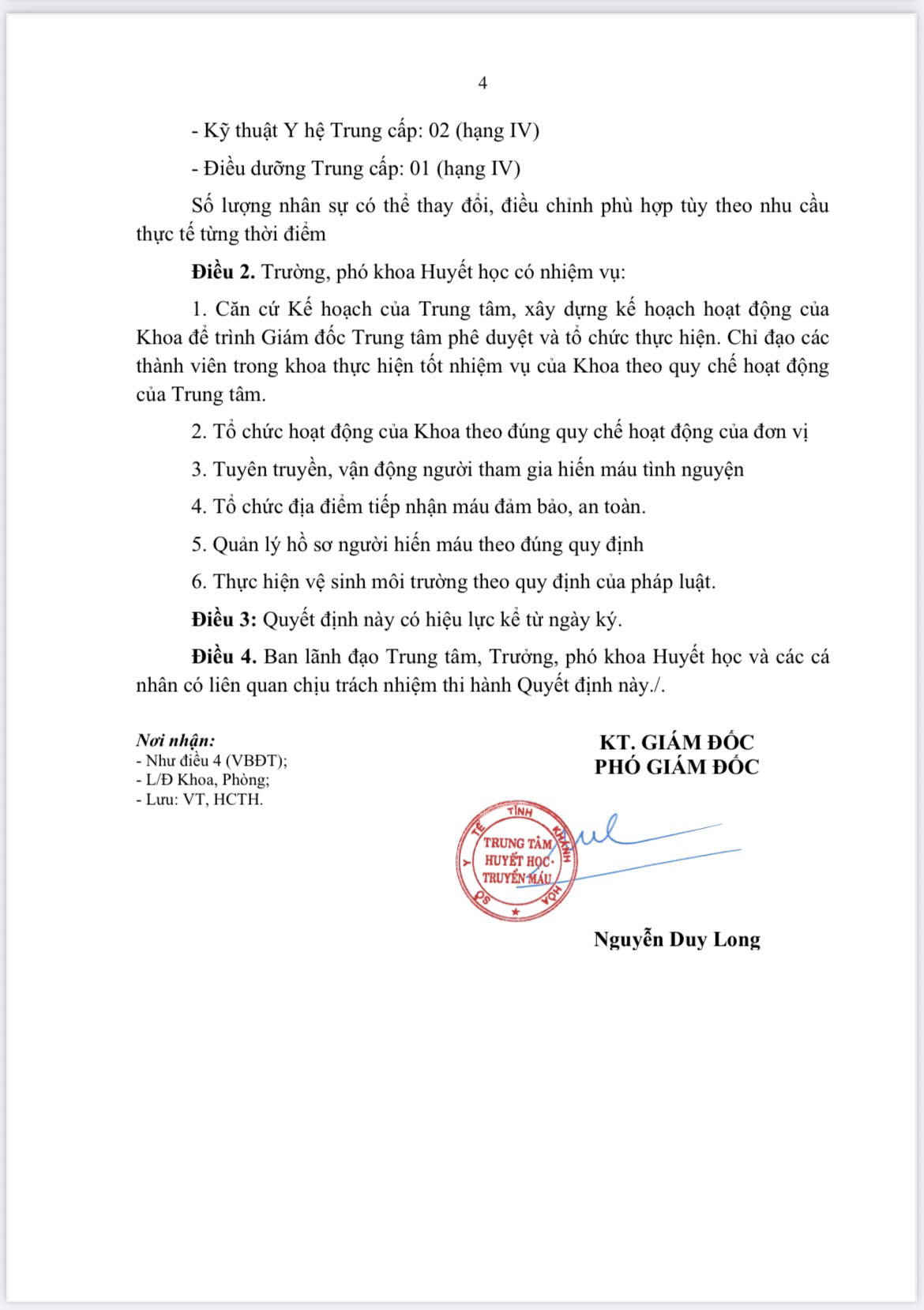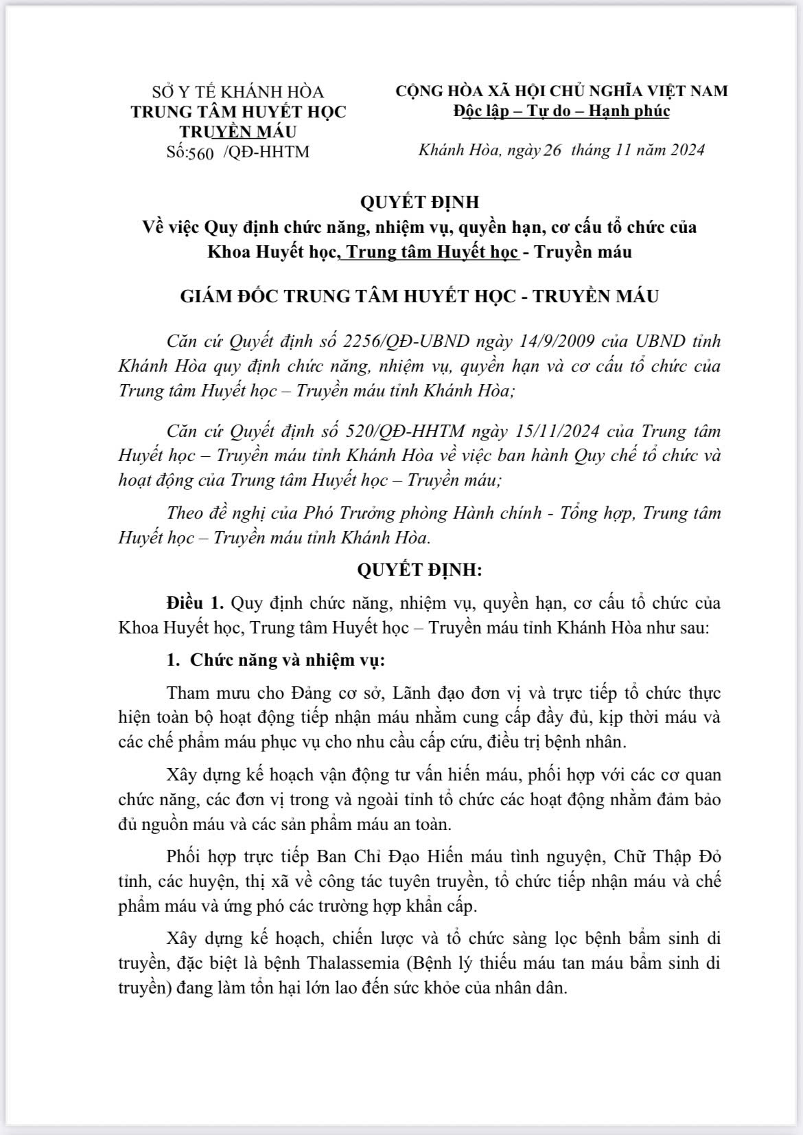 - Quyết định số 560/QĐ-HHTM ngày 26/11/2024 của Trung tâm Huyết học - Truyền máu Khánh Hoà, về việc Quy đinh chức năng, nhiệm vụ, quyền hạn, cơ cấu tổ chức của Khoa Huyết học, Trung tâm Huyết học - Truyền máu.